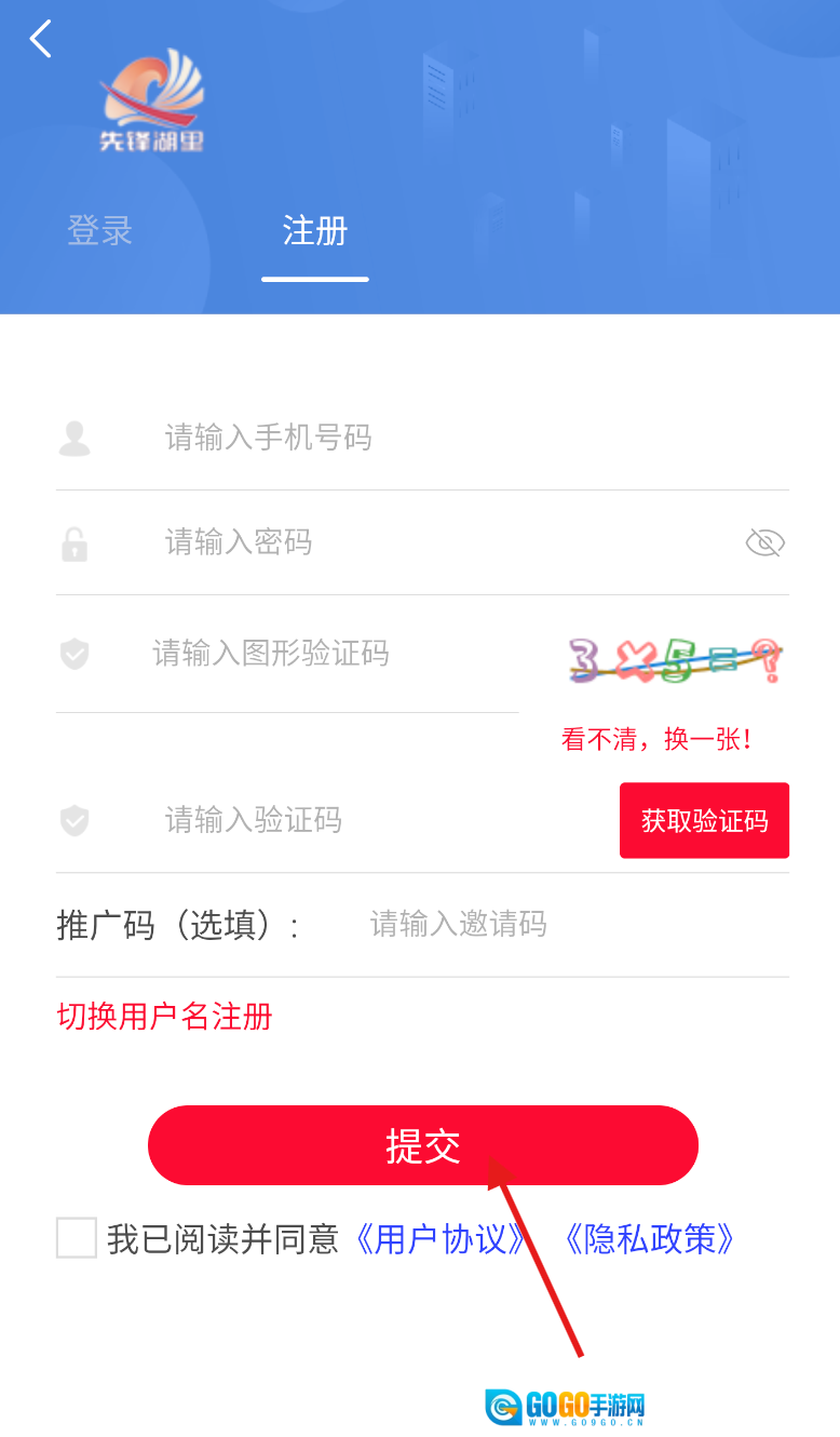 4、进入注册界面后,按顺序填写手机号、设置密码、输入验证码,仔细核对确认信息无误后,点击提交按钮即可完成注册流程。