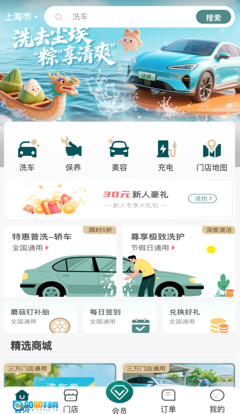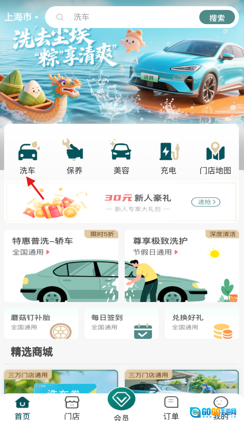 1、打开达鸽软件进入主界面,在显眼处找到“洗车”选项并点击进入。