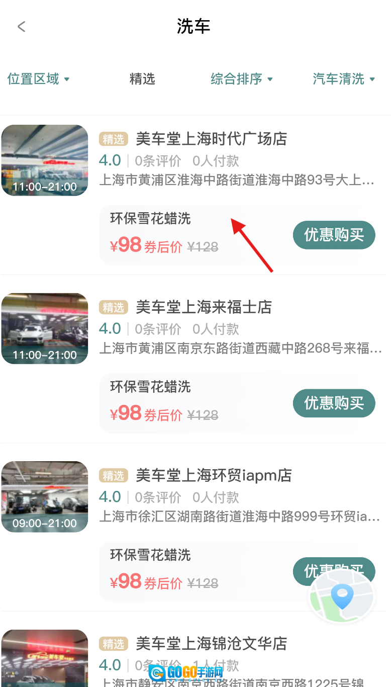 2、查看洗车店铺的列表,依据评分、距离等信息,挑选一家感兴趣的店铺来查看其详细情况。