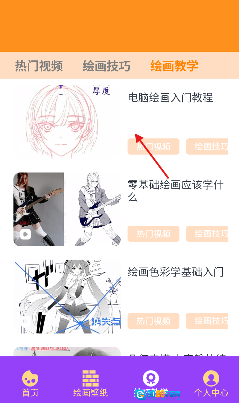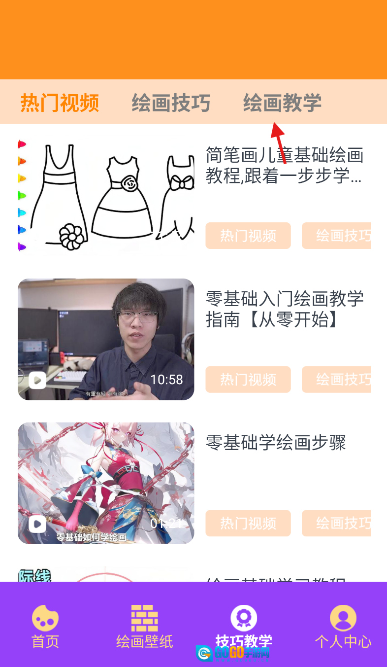 2、在跳转至的技巧教学页面里,需清晰展示各类教学分类,从中选择并点击“绘画教学”板块。