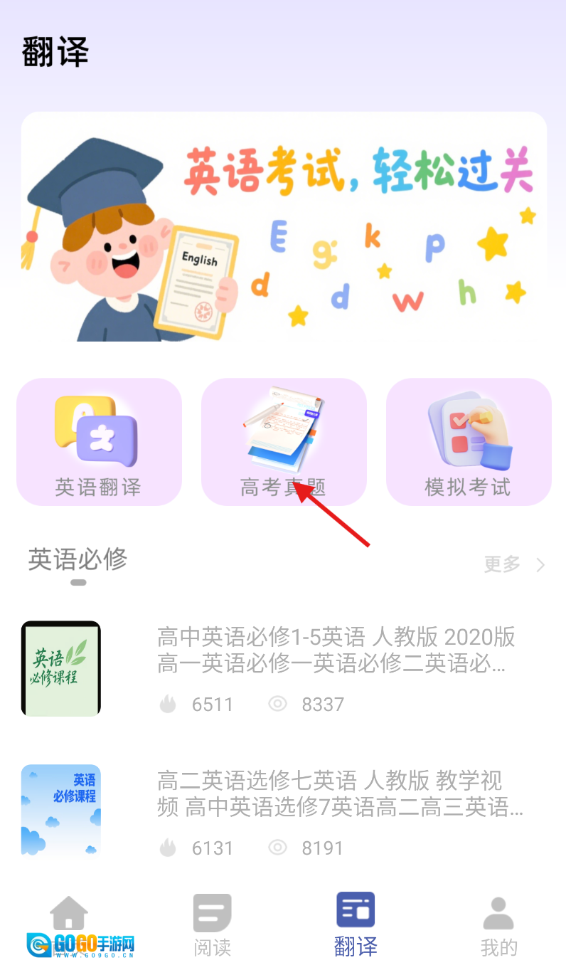 2、进入翻译页面后,在众多功能模块里找到“高考真题”板块并点击它。