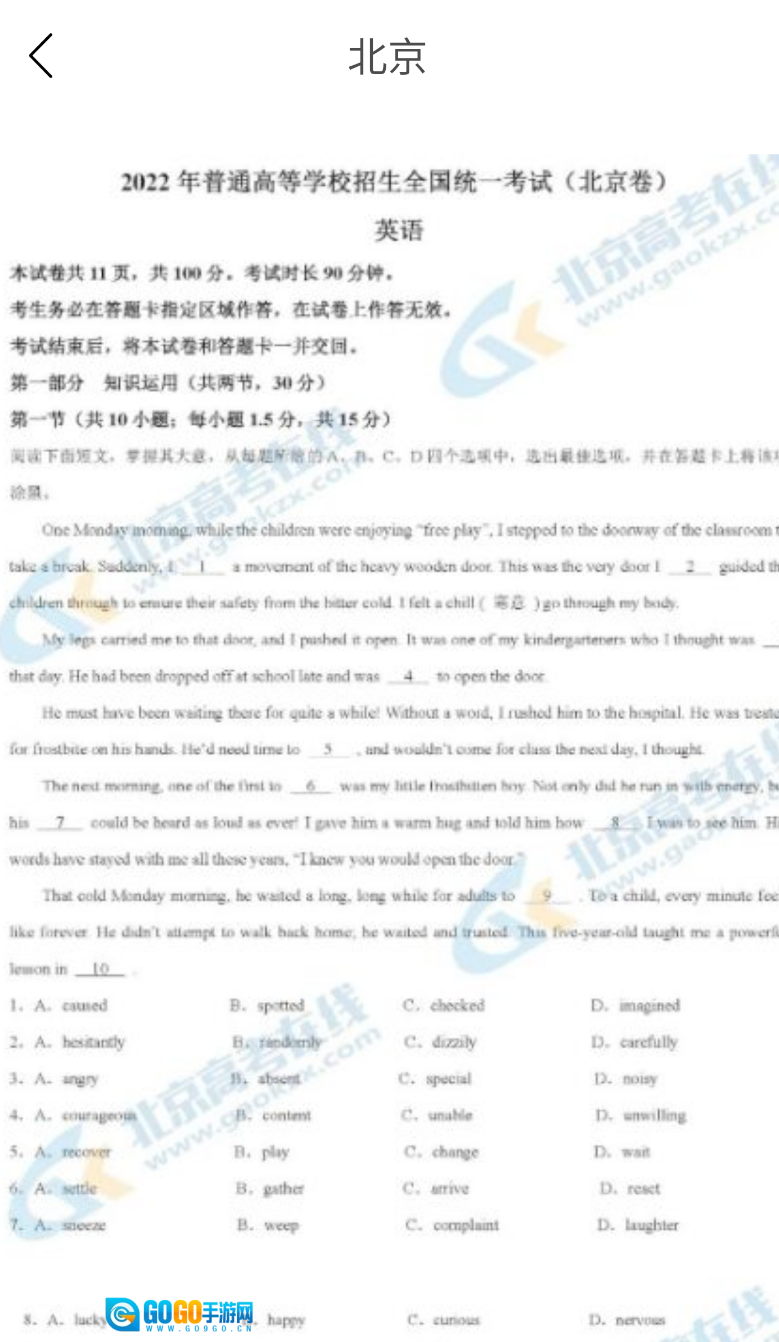 4、选好地区后,页面会自动展示往年的北京英语高考真题,届时就能开始查看了。