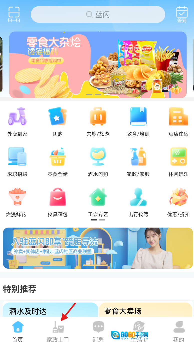 1、启动蓝闪软件,在主界面底部的导航栏里找到“家政上门”选项并点击。