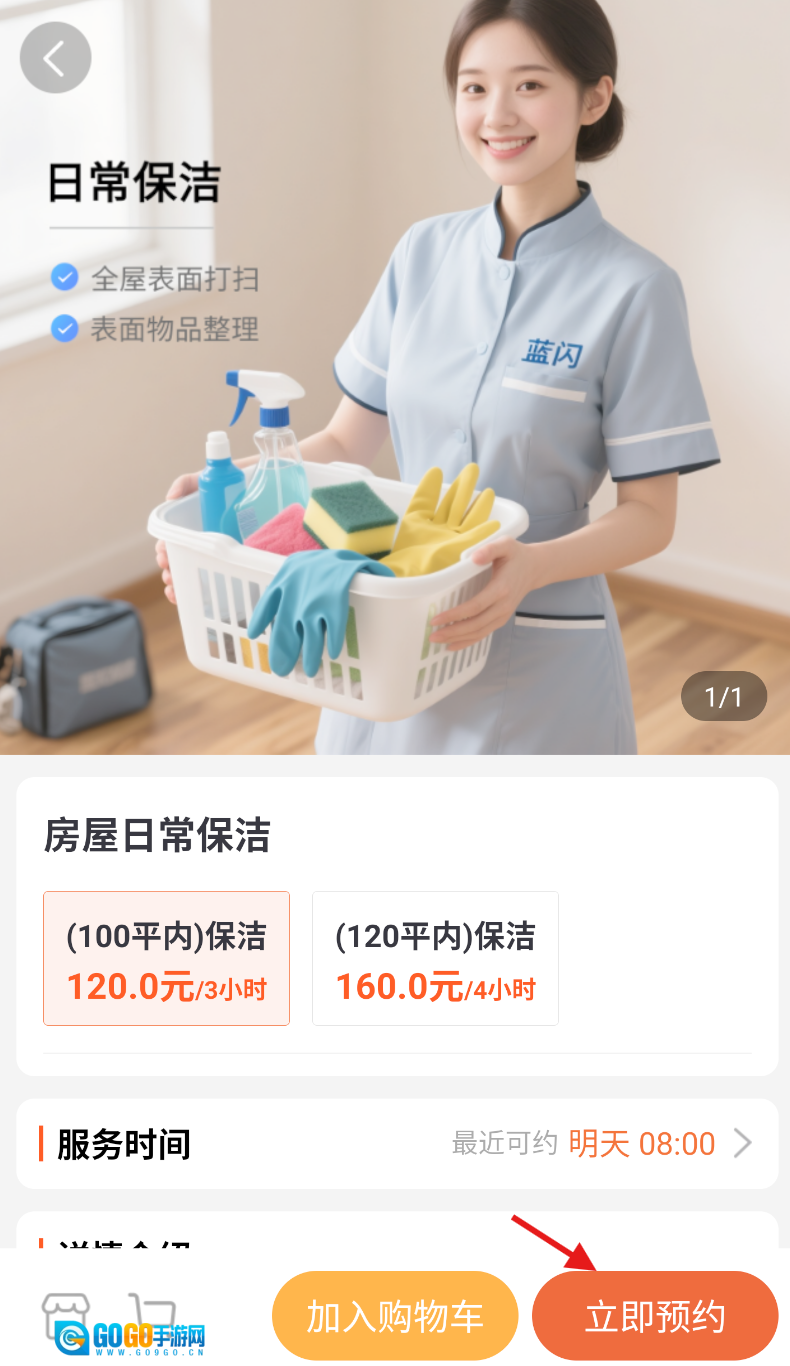 3、查看保洁清洗服务的具体内容,在明确自身需求后,点击页面右下方的“立即预约”按钮。