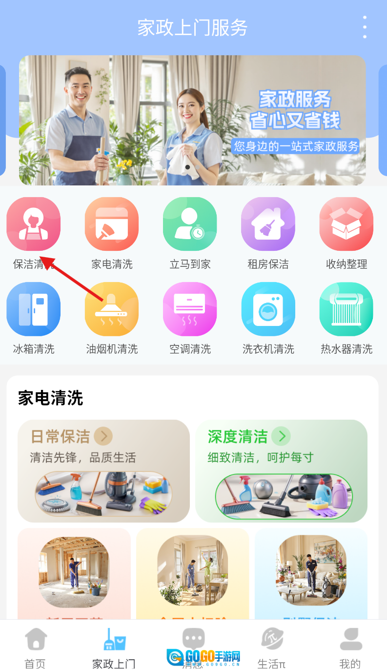 进入家政上门页面后,在众多服务类别里,点击并选中“保洁清洗”板块。