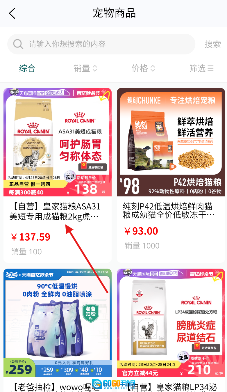 2、进入宠物商品页面,浏览各类猫粮产品,挑选出感兴趣的款式并点击进入详情页进行查看。