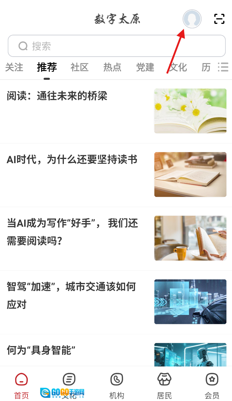 1、打开数字太原应用进入首页,在界面右上方找到头像图标并点击打开。