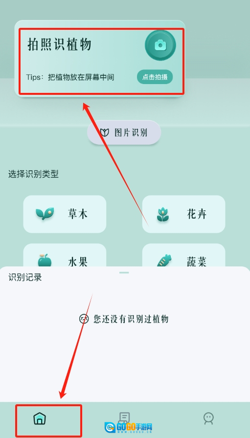 1、打开软件进入首页后,会看到拍照按钮,直接用它对着花草拍摄一张照片,就能识别出花草的种类了。