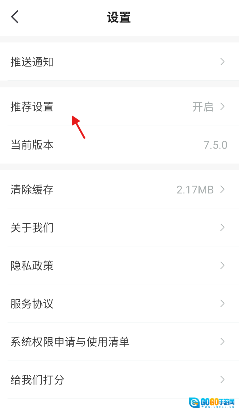 3、进入设置页面后,找到并点击“推送设置”选项,即可进入推荐设置管理界面。