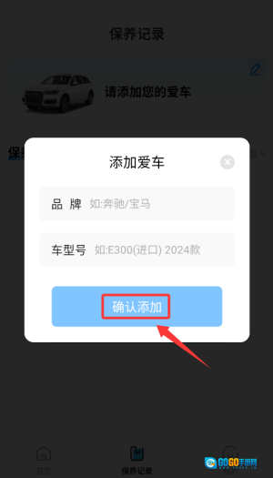 3、依次输入车辆的品牌、型号与生产年份信息后,点击“确认添加”按钮,即可完成车辆绑定的全部流程。