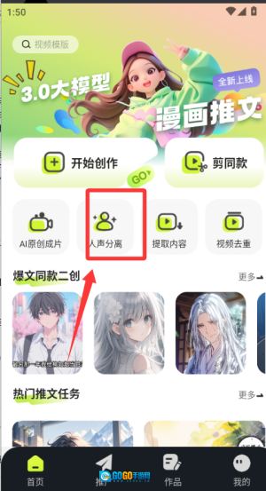 2、借助人声分离工具,上传含有清晰人声的视频或音频文件,点击“分离”按钮后,就能分别提取出纯净的人声轨道或背景音乐轨道。