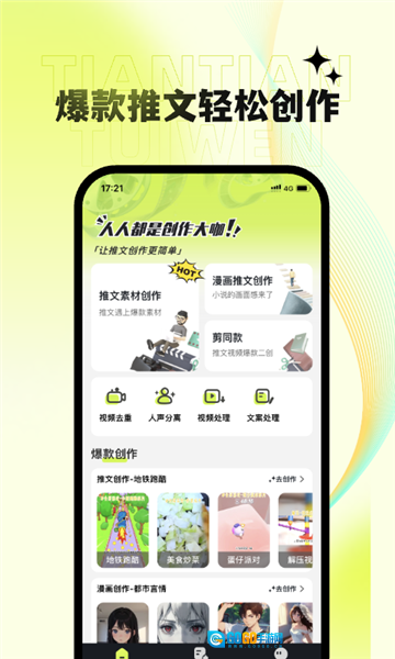 天天推文是一款专为内容创作者与营销人员打造的小说推文创作工具,能为用户提供创作辅助,助力完成小说推文及短视频的创作流程。平台拥有覆盖情感、职场、科技等全领域的海量热门素材库,且每日实时更新热门视频资源,用户可通过自由组合与创新,打造出独具特色的差异化推文作品。此外,该软件还具备根据关键词自动生成标题和正文的功能,有效提升创作效率。