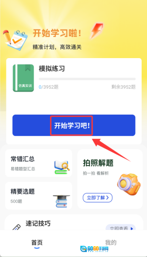 进入学法减分易后,在首页找到并点击“开始学习”按钮,即可进入题库选择界面。
