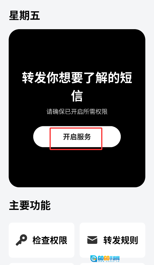 开启墨囊短信转发功能后,需点击首页的“开启服务”按钮,以此激活短信监控权限。