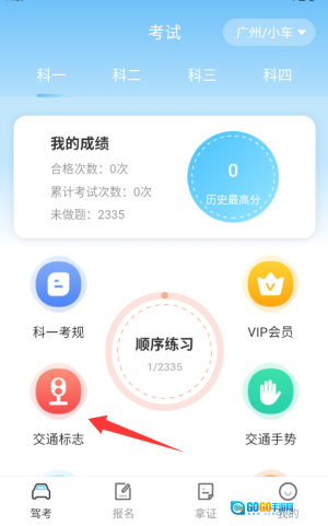 进入学驾驶证科目一科目四无忧后,在首页找到“交通标志”专题并点击,即可进入对应的学习页面。