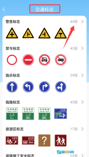 3、你可以通过上下滑动屏幕来浏览更多交通标志,系统会按照类别展示各类禁令标志、指示标志以及警告标志。