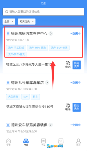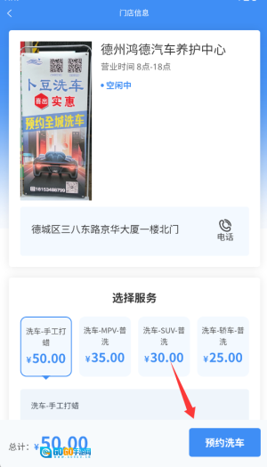 3、选好门店后点击“预约洗车”,接着挑选服务时间并确认订单,就能完成洗车预约了。