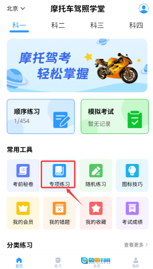 1、打开摩托车驾照学堂后,在首页的菜单栏里找到并选择“专项训练”功能,即可进入题库分类界面。
