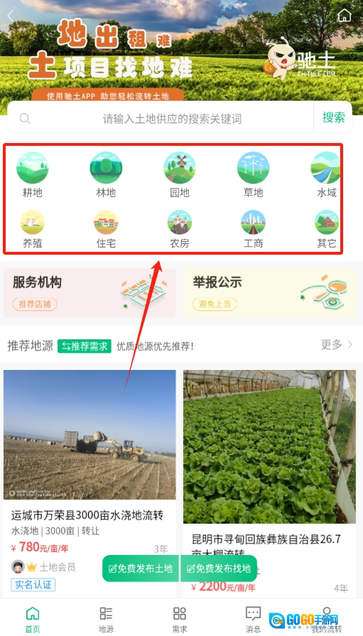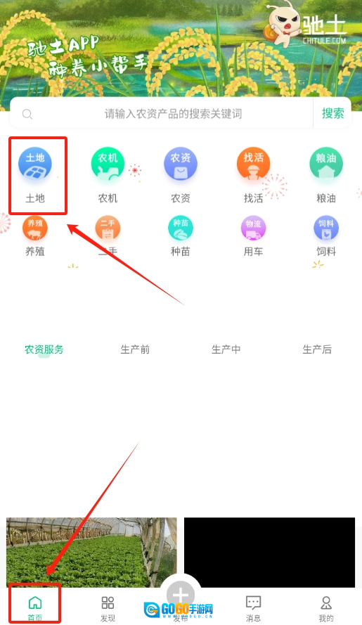 1、启动吃土农服软件后,首先看到的是软件首页,在首页展示的众多功能选项里,找到并点击“土地”这一选项。