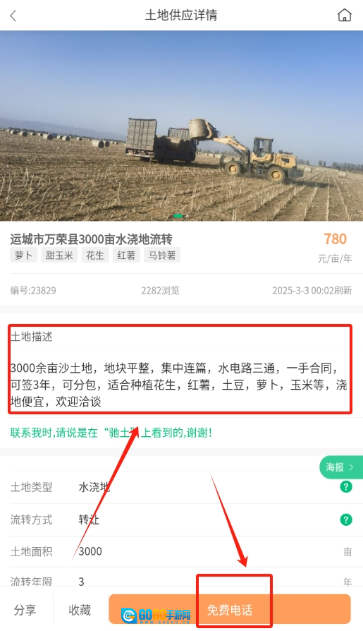 3、要是确定想买,不用着急,点击页面右下角的免费电话标识,就能联系土地主人沟通详情。