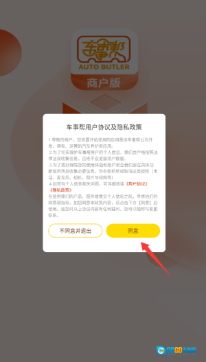 1、登录车事帮智慧门店后,系统会弹出用户协议与隐私政策,需要仔细阅读并同意相关条款。
