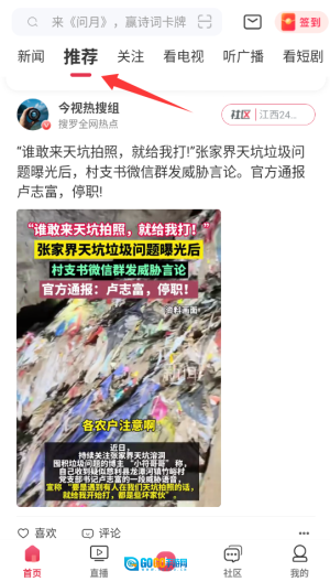 1、打开今视频应用后,进入首页的“推荐”板块,就能浏览到实时更新的精选资讯,这些内容会在每天自动刷新。
