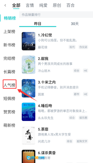 2、在榜单分类里找到“人气作品”标签,这里收录了近期最受读者喜爱的热门小说列表。