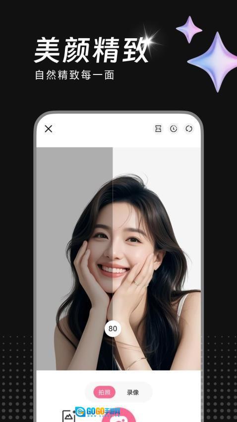 1、AI美效相机采用深度学习算法,实现智能人像美化处理,在保留皮肤质感的同时自然修饰面部瑕疵。