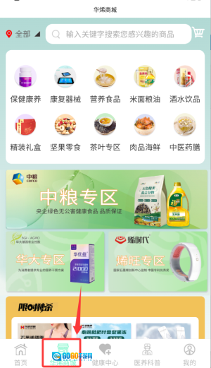 1、打开华烯健康应用后,在首页底部的导航栏中找到“华烯商城”的入口,点击该入口即可进入商品选购界面。