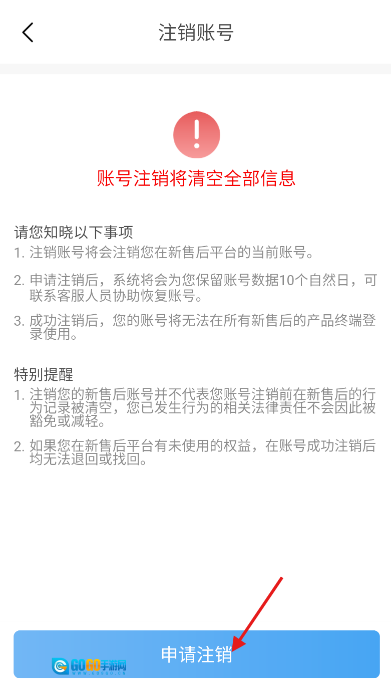 4、进入注销账号页面后,认真阅读相关提示信息,在确认所有内容无误的情况下,点击“申请注销”按钮,以此完成账号注销的全部流程。