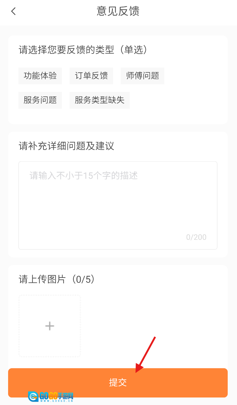 3、进入意见反馈页面后,先选择对应的反馈类型,再详细描述遇到的问题,最后点击提交按钮即可完成反馈。
