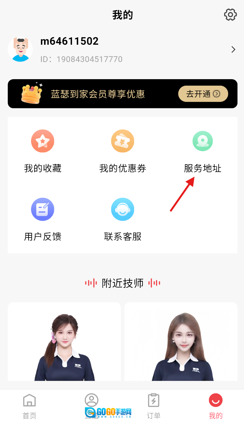 跳转至个人页面后,在相关功能列表里找到标有“服务地址”的入口,点击进入即可。