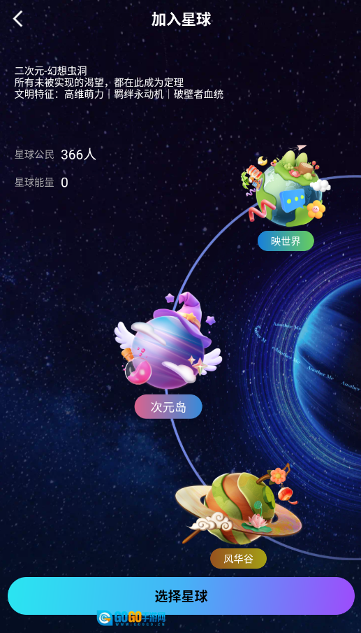 1、启动程序后,在星球选择界面进行浏览,找到感兴趣的星球并点击,即可进入创建流程。