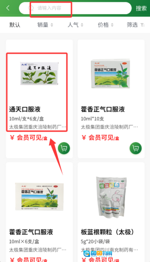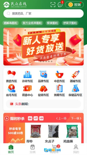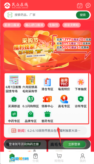 进入民众在线后,在首页栏直接点击“药品专区”按钮,即可跳转至药品选购页面。