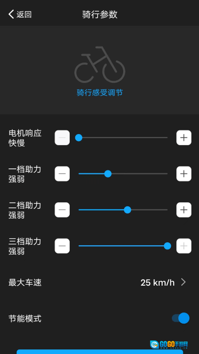 2、进入骑行体验调节界面,可依据自身需求对电动车的速度、灵敏度等参数进行调整。