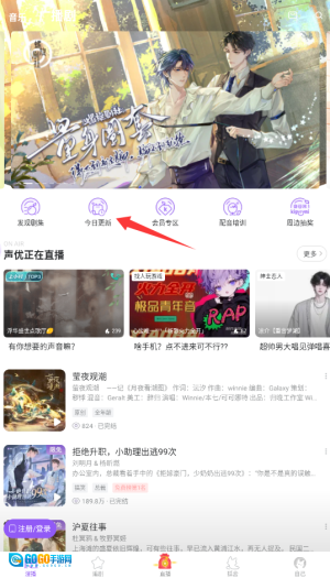 1、打开克拉漫播应用后,在首页的顶部导航栏中找到并点击“今日更新”板块,该板块会呈现当天上线的最新漫画资源。