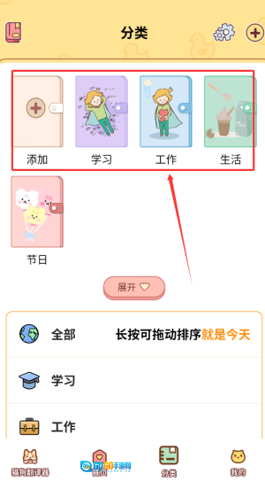 3、进入分类页面后,你可以添加学习、工作、生活等各类需要记录的事项。