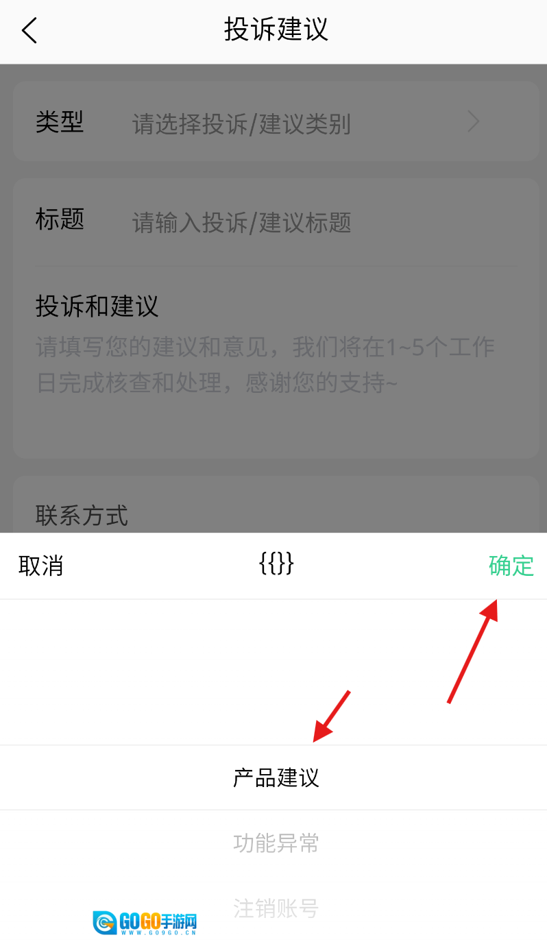 3、跳转至投诉建议页面,依据实际情况从类型列表里挑选对应的类别并确认选择。