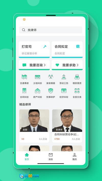 安装完成后打开应用,进入首页就能浏览到各类法律纠纷对应的服务类型。