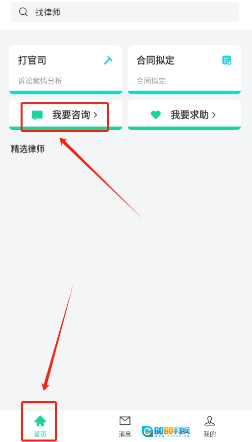 3、成功登录后系统会自动跳转回主页面,此时点击首页的“我要咨询”按钮即可向律师进行咨询。