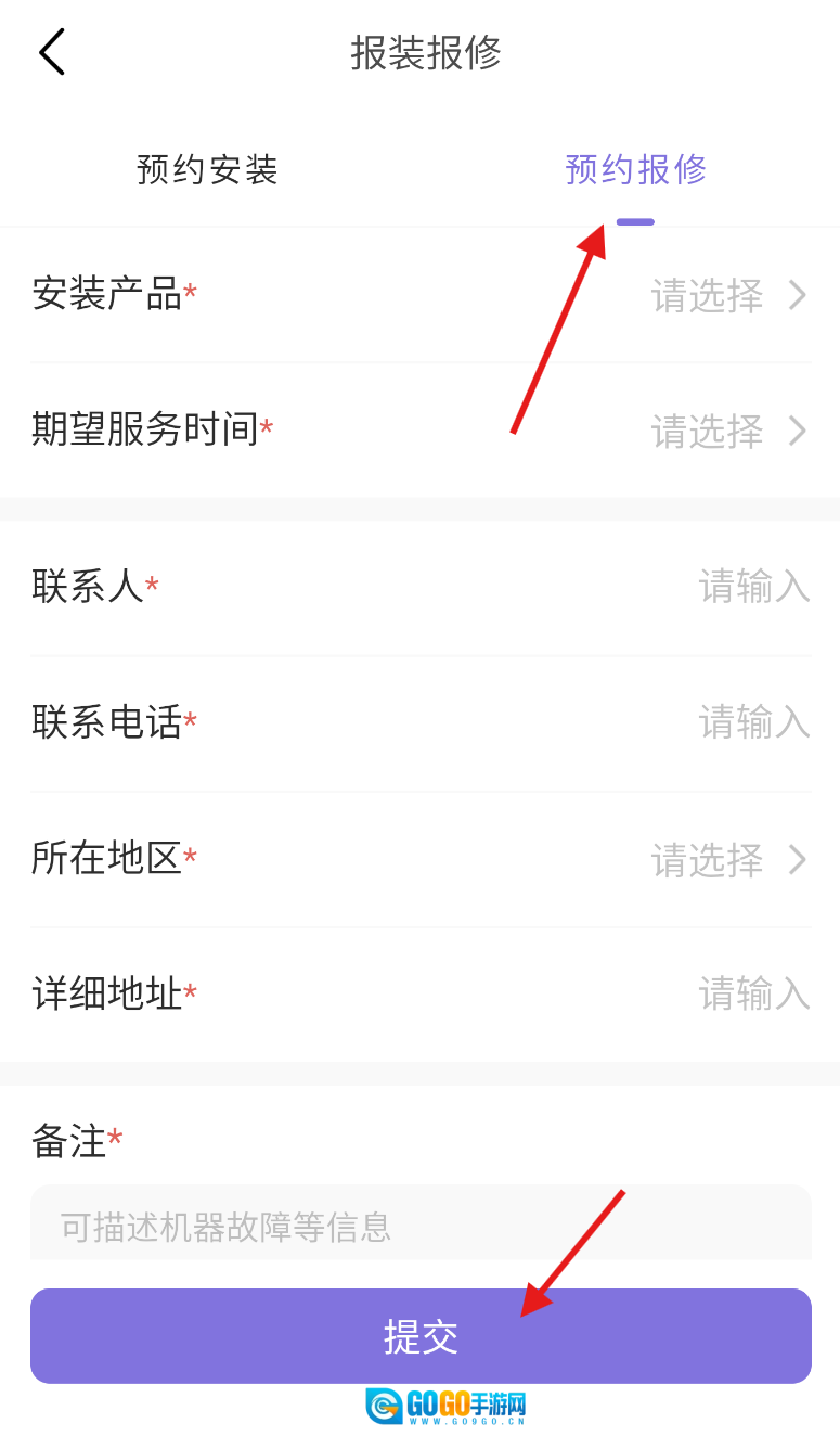 4、进入预约报修页面后,仔细填写设备故障情况、联系电话等相关信息,检查确认内容准确无误后提交报修申请。