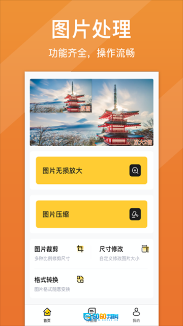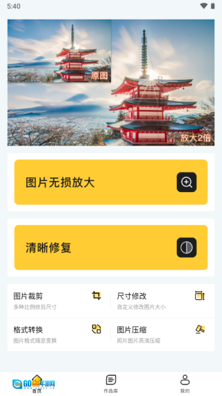 1、首页板块包含图片无损放大、清晰修复、裁剪、尺寸修改、格式转换、压缩等功能。您只需直接点击想要使用的功能即可操作。