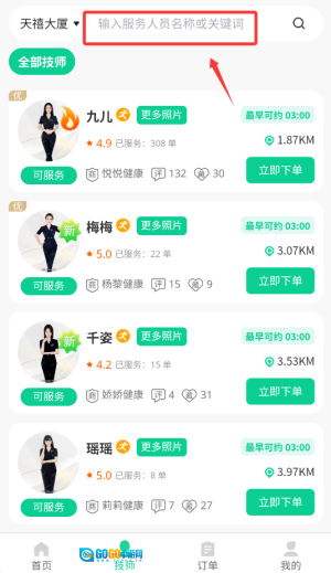 2、可以借助搜索栏输入关键词来查找特定服务,也能直接筛选附近的服务人员并查看他们的评价。
