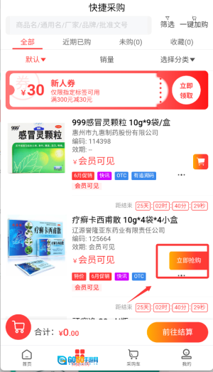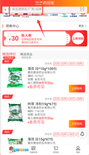 2、在查询框中输入药品名称,然后筛选出所需的商品规格和型号。