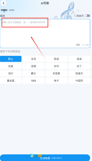 3、用户仅需输入风格、情绪类关键词(例如轻快电子乐、舒缓钢琴曲等),系统就能自动生成完整的音乐作品。