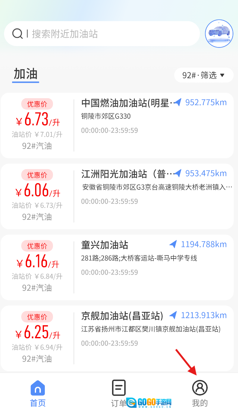 3、查询加油:打开首页,查看附近加油站的油价,选好加油站后点击导航前往,加完油后挑选支付方式完成结算。