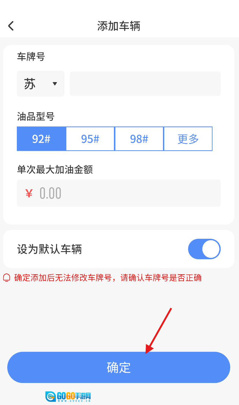 4、在弹出的添加页面中,按顺序填写车牌号、选择油型,并设置单次加油的最高金额,检查确认所有信息准确无误后,点击确定按钮即可完成添加操作。