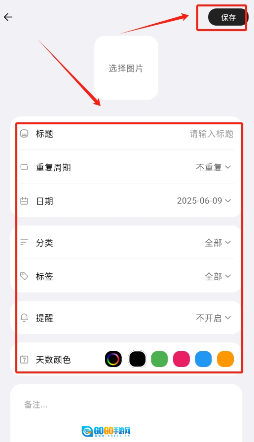 3、输入标题、是否重复、日期、分类、标签、提醒以及天数颜色这些具体信息后,点击右上角的保存按钮。