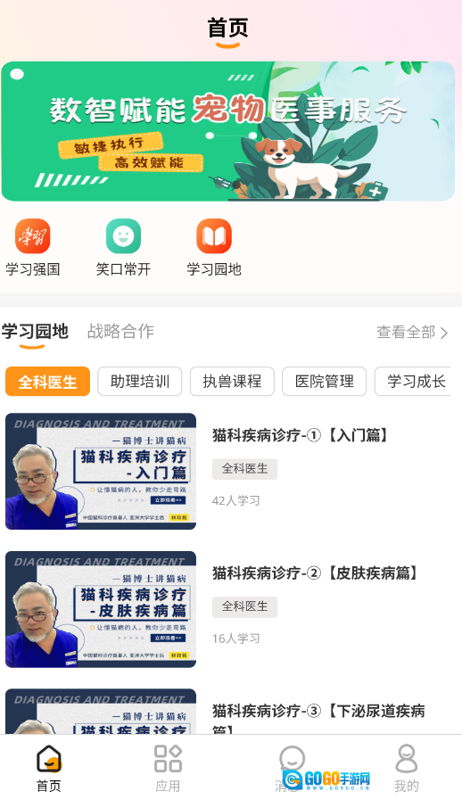 1、打开宠医宝应用后,点击首页的“学习园地”板块,浏览并挑选自己感兴趣的宠物医疗相关课程。