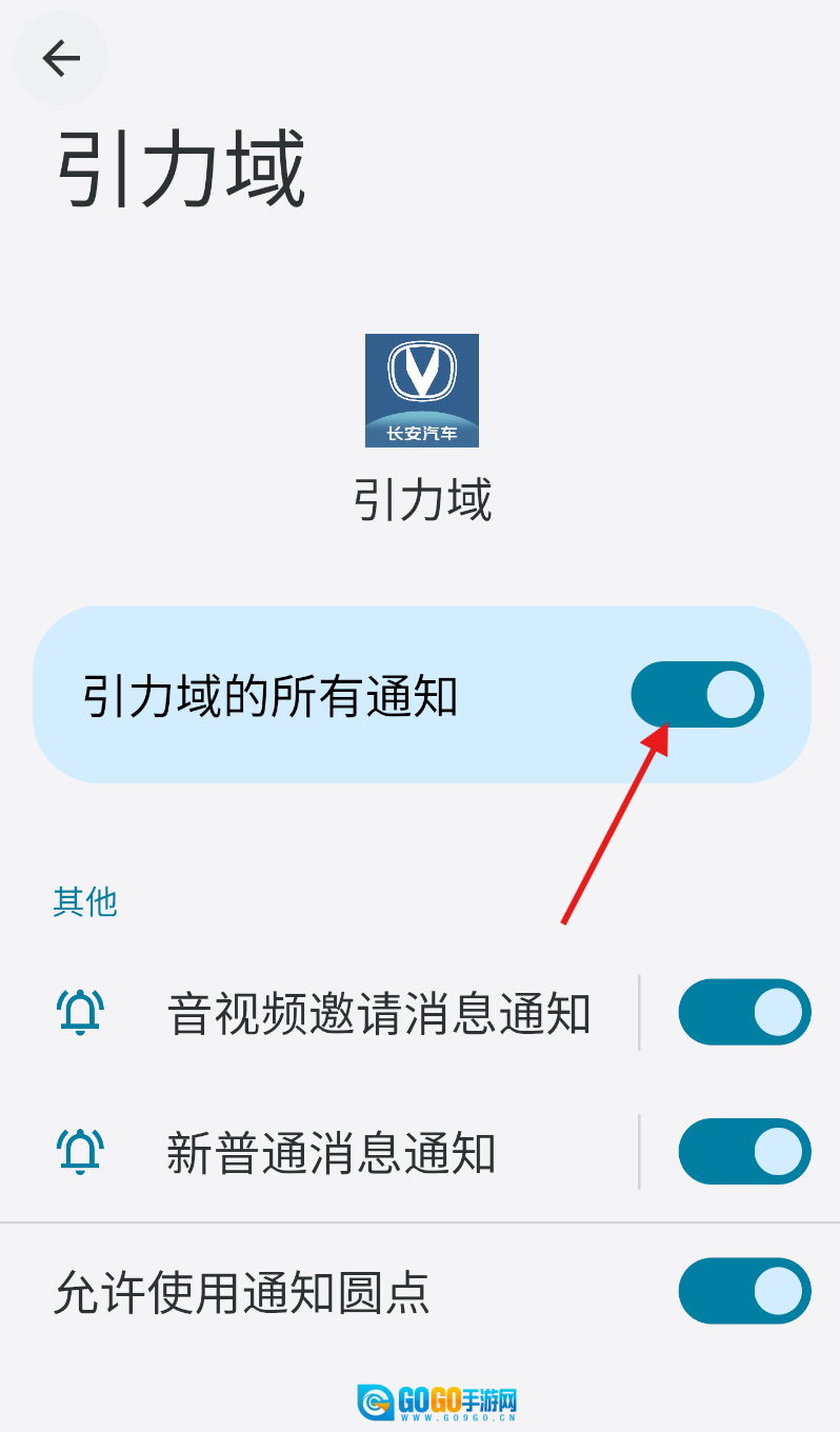4、进入通知管理界面后,找到引力域相关的各项通知选项,点击对应的开关按钮,就能关闭对应的消息提醒。